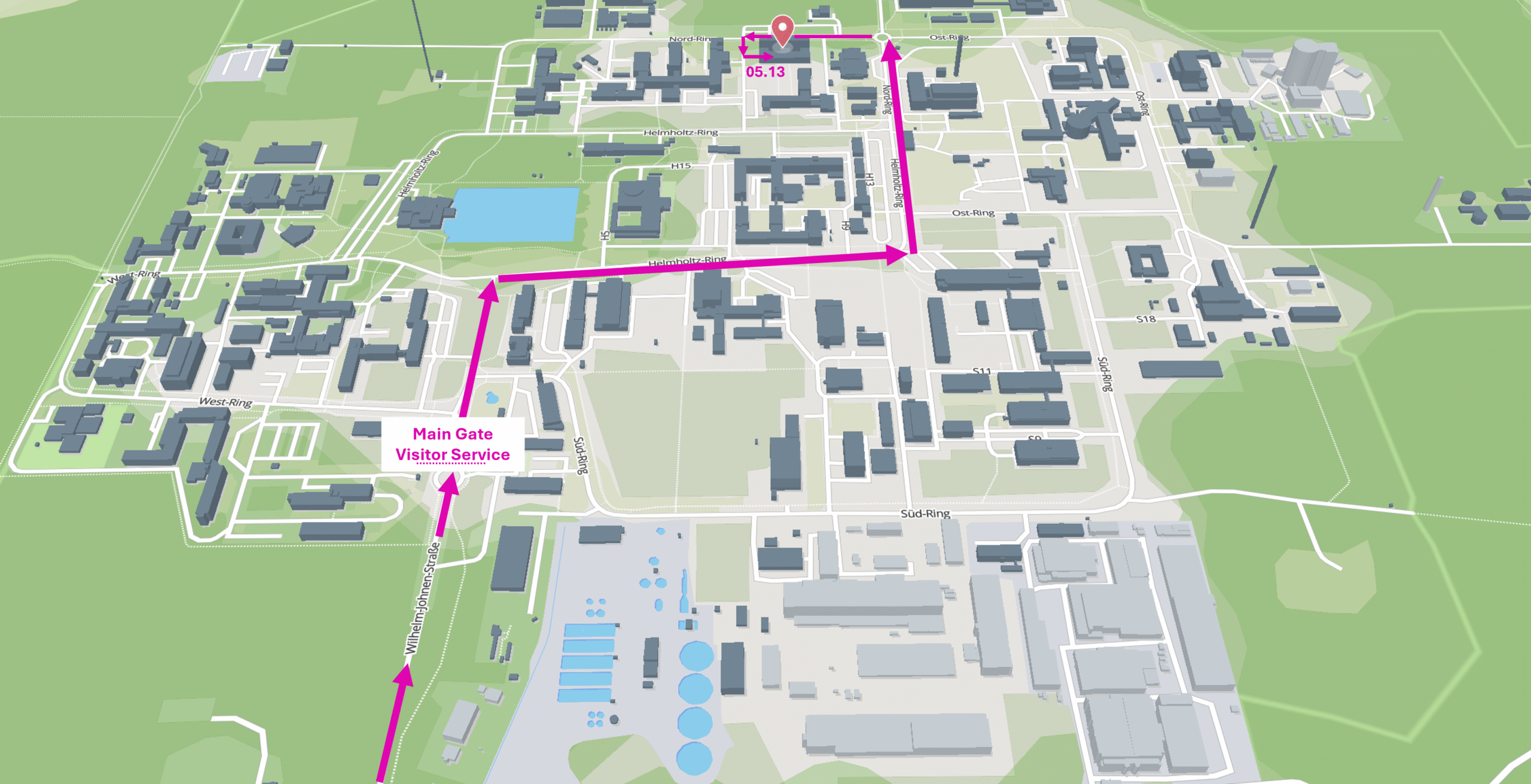 If you travel by car, you can enter the campus through the main gate at “Wilhlem-Johnen-Straße”. Follow the route indicated in the image below to reach building 05.13 where the event will be held. Parking is available on campus free of charge, but capacity is limited.