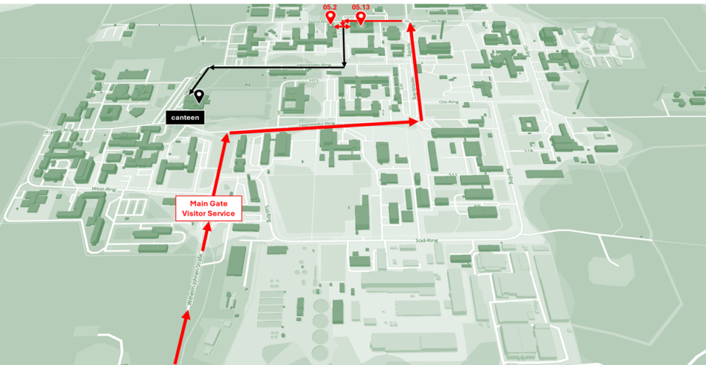 If you travel by car, you can enter the campus through the main gate at “Wilhlem-Johnen-Straße”. Follow the route indicated in the image below to reach building 05.13 where the event will be held. Parking is available on campus free of charge, but capacity is limited.